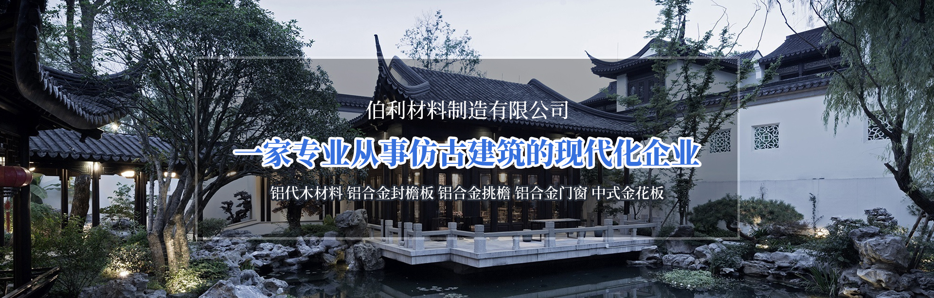 黑龍江伯利材料制造有限公司是一家專業從事仿古建筑的現代化企業,由于中國的強大,民族自信心回歸對中華文化的向往,名人志士對中華文化的弘揚,從建筑形式上采取古法新材料的結構。以現代工業材料“鋁”代替傳統的木材。從美觀,耐久和造型對古建的一次升華。本公司主要經營仿古建筑的設計,施工,構件制作安裝,仿古門窗,仿古掛件,仿古屏風焊接及雕刻制作,各種亭,廊,閣,榭的制作安裝。與之配套的仿石構件制作安裝,小品雕塑。也為現代建筑配套鋁單板,幕墻制作安裝。目前是東北三省一家從事仿古建筑及“鋁代木”項目的企業。